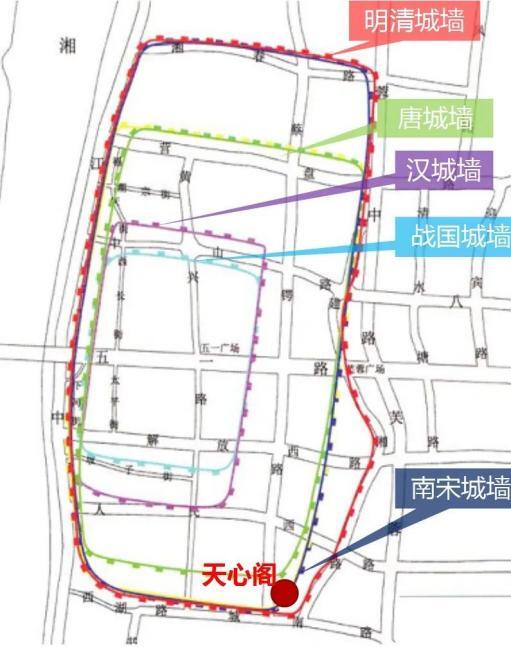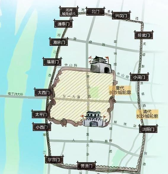 自战国起,长沙主城一直以现在的五一广场为圆心,衍射四周。明朝时,长沙有九座城门,如九枚扣子紧紧扣住城市命脉。西临湘江的大西门、小西门吞吐千帆商船,东向的浏阳门、小吴门衔接赣粤商道,南向黄道门(南门)与北向湘春门,则构成直通古今的“黄金中轴”……